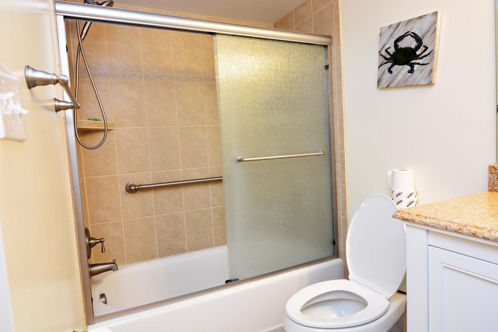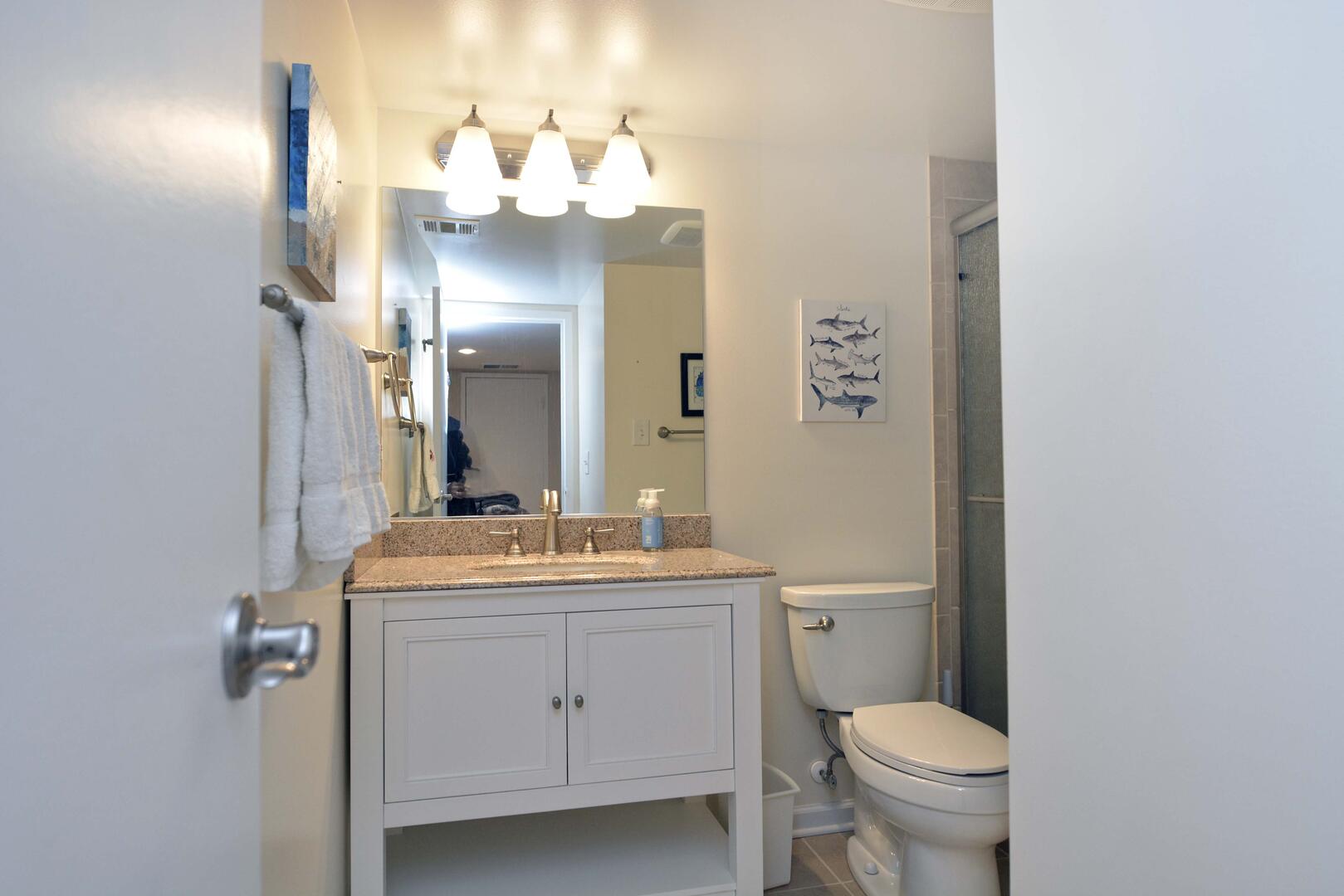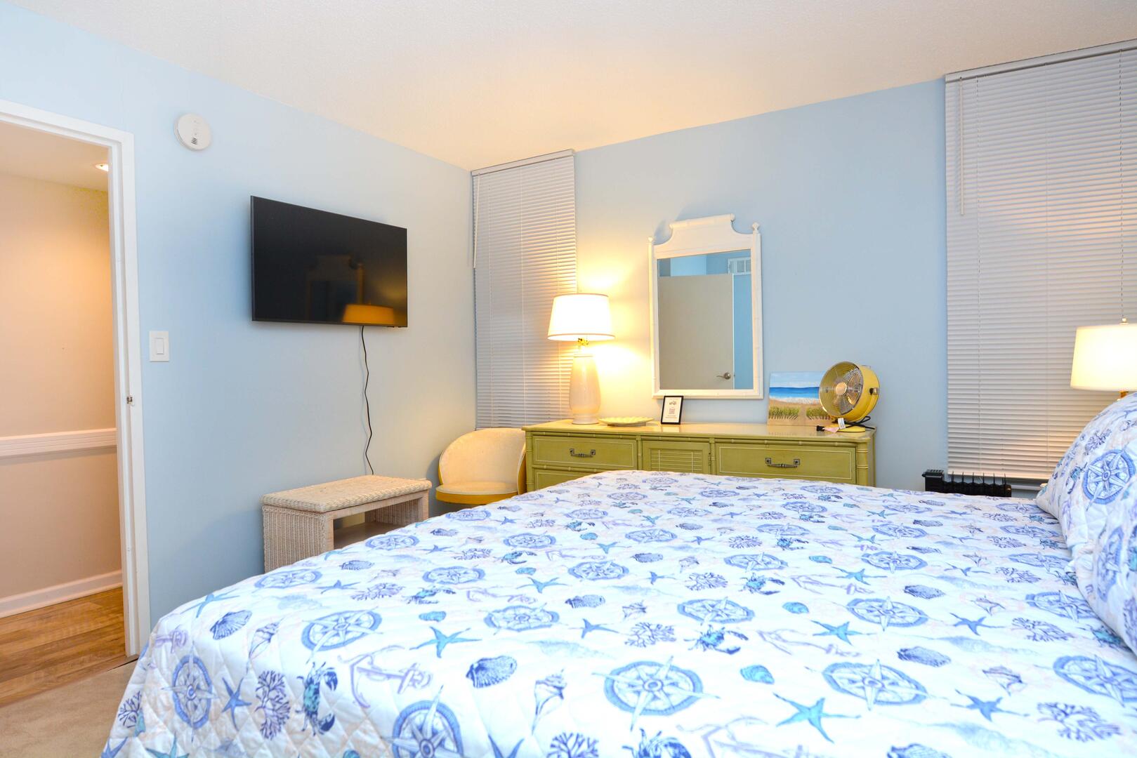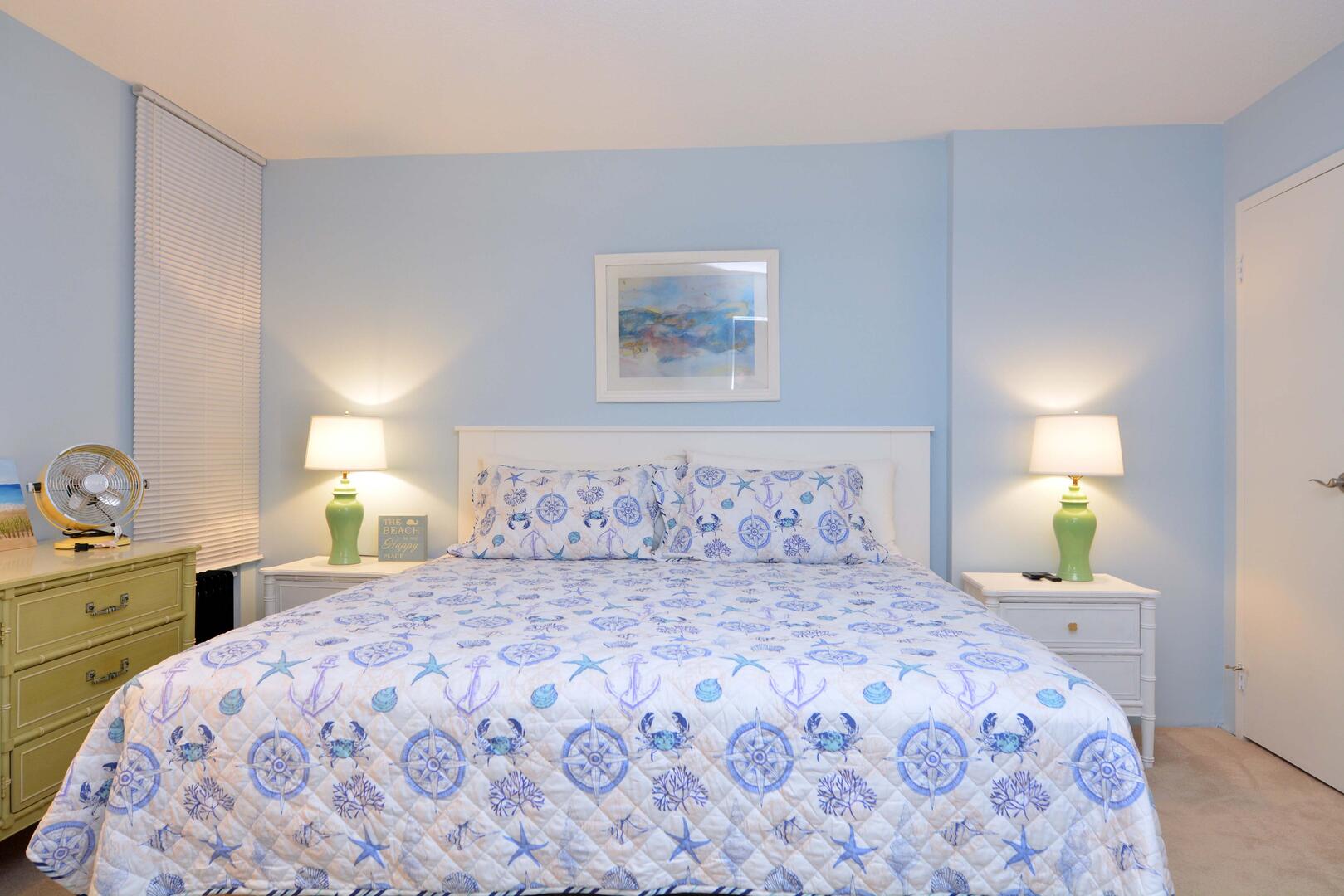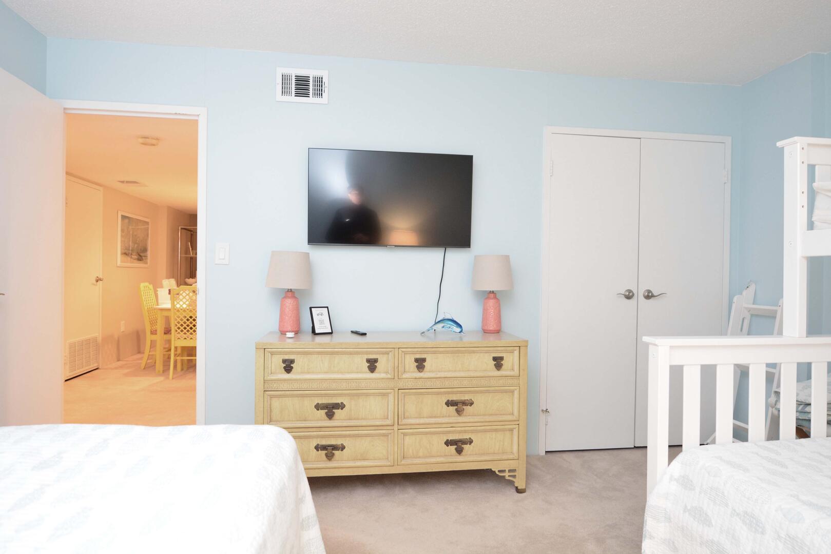 The spacious living room is furnished with a comfy couch, cozy chairs and a television. The sliding balcony doors allow plenty of natural light to brighten the space. Right off the living room is a small dining area, perfect for meals with the family. Next to the dining area is the fully-stocked kitchen with a wide counter top, just right for grabbing a quick bite. The master bedroom has a king size bed, a television, and a private bathroom. The second bedroom has a queen bed with a bunk bed, that has a queen on bottom and a twin on top . The second bathroom is located in the hallway. This property comfortably sleeps up to seven people, so bring the whole family!