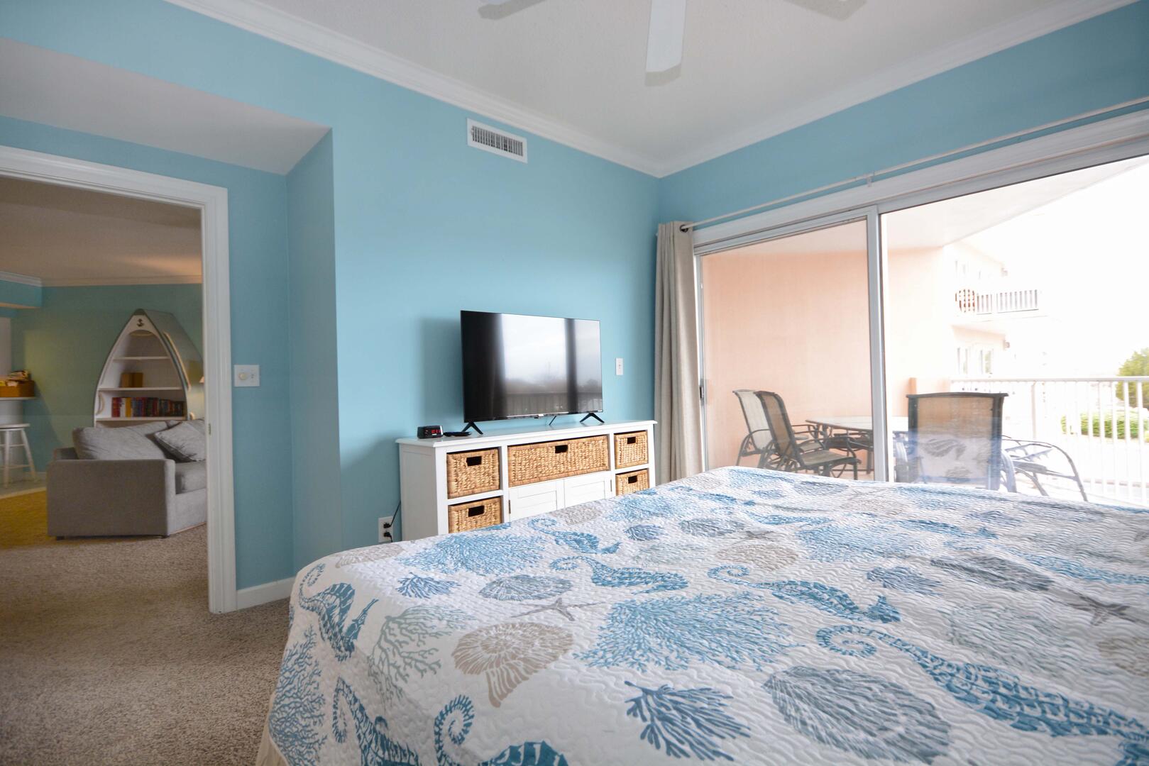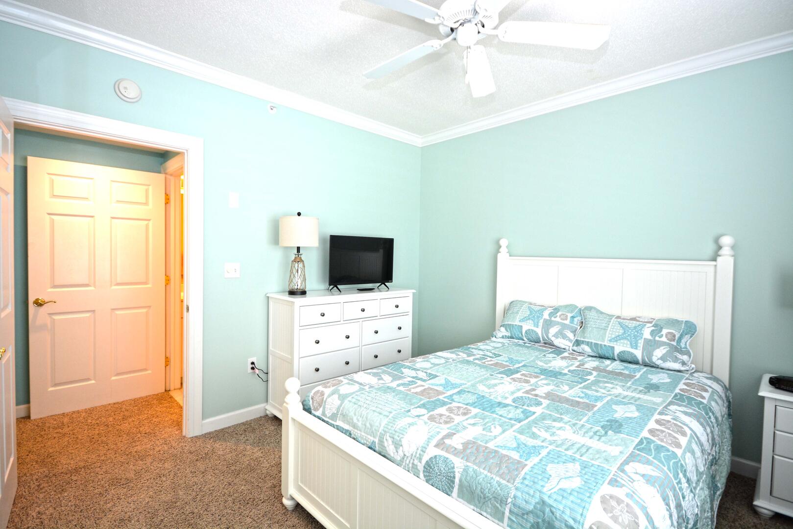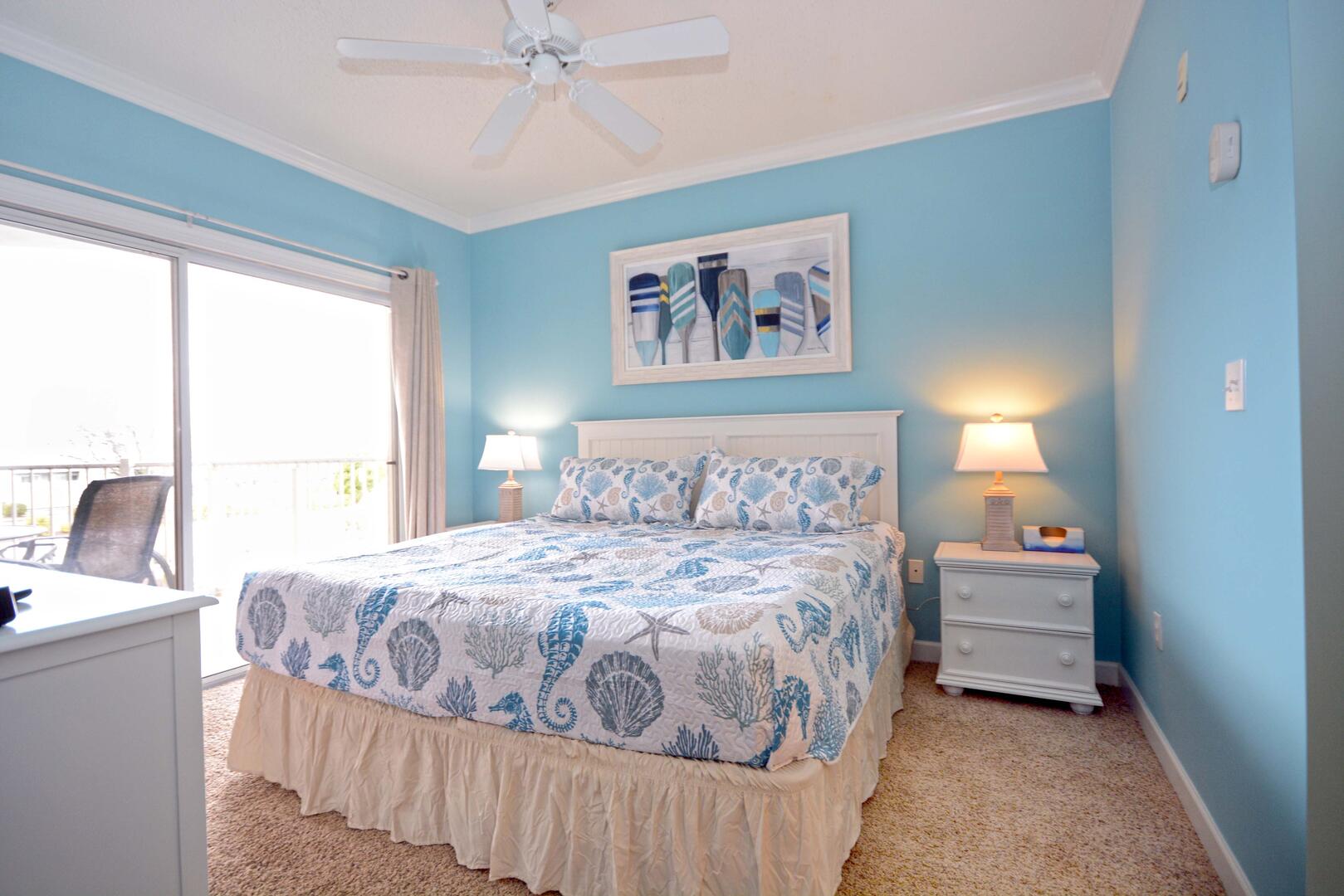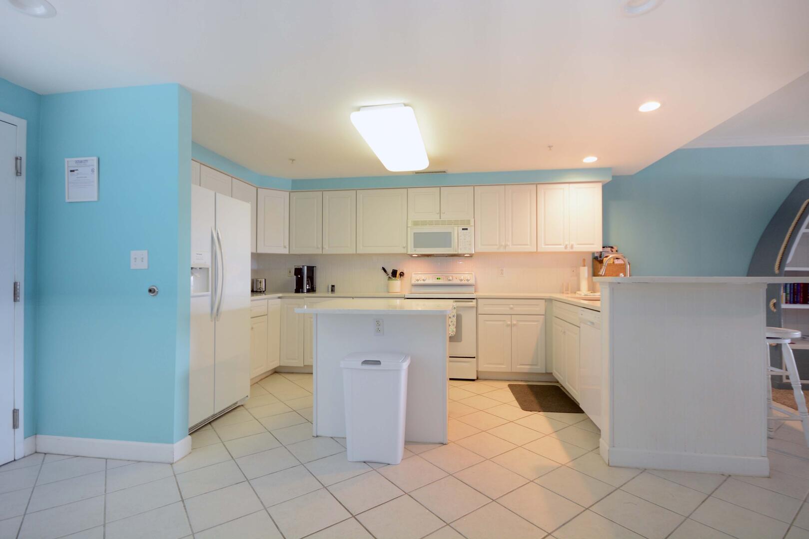 The living room is furnished with a comfortable couch, a section sofa with a queen sleep sofa and a flat screen television. The sliding balcony doors allow plenty of natural light to brighten the space. Right off the living room is a small dining area, perfect for meals with the family. Next to the dining area is the fully-stocked kitchen with a wide counter top, just right for grabbing a quick bite. The master bedroom has a king-size bed, a flat screen television, a private bathroom, and access to the balcony. The second bedroom has a queen-size bed, a flat-screen television, and balcony access. The third bedroom has a double size bed and twin, a television, and access to the hall bathroom. This property comfortably sleeps up to nine people, so bring the whole family!
