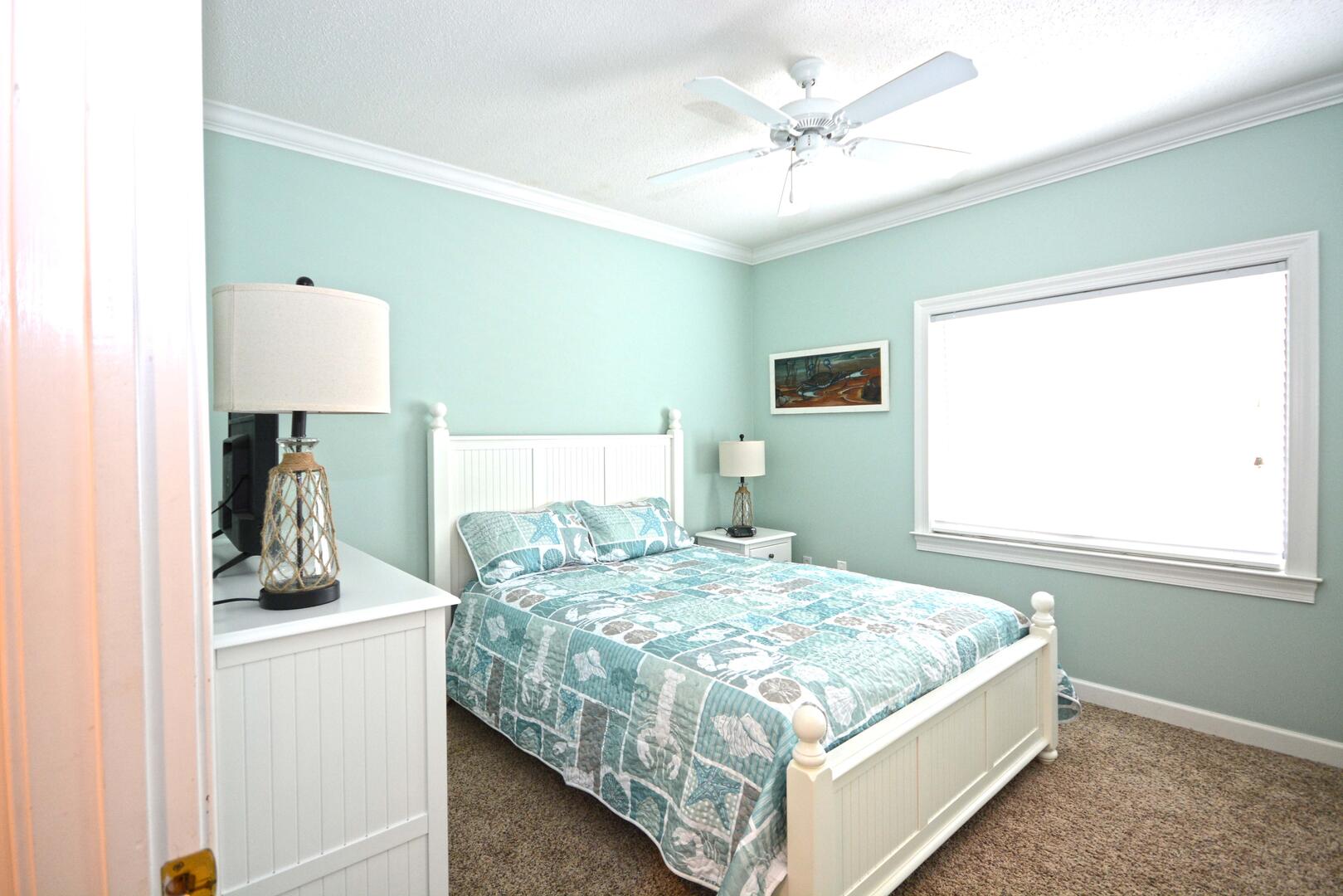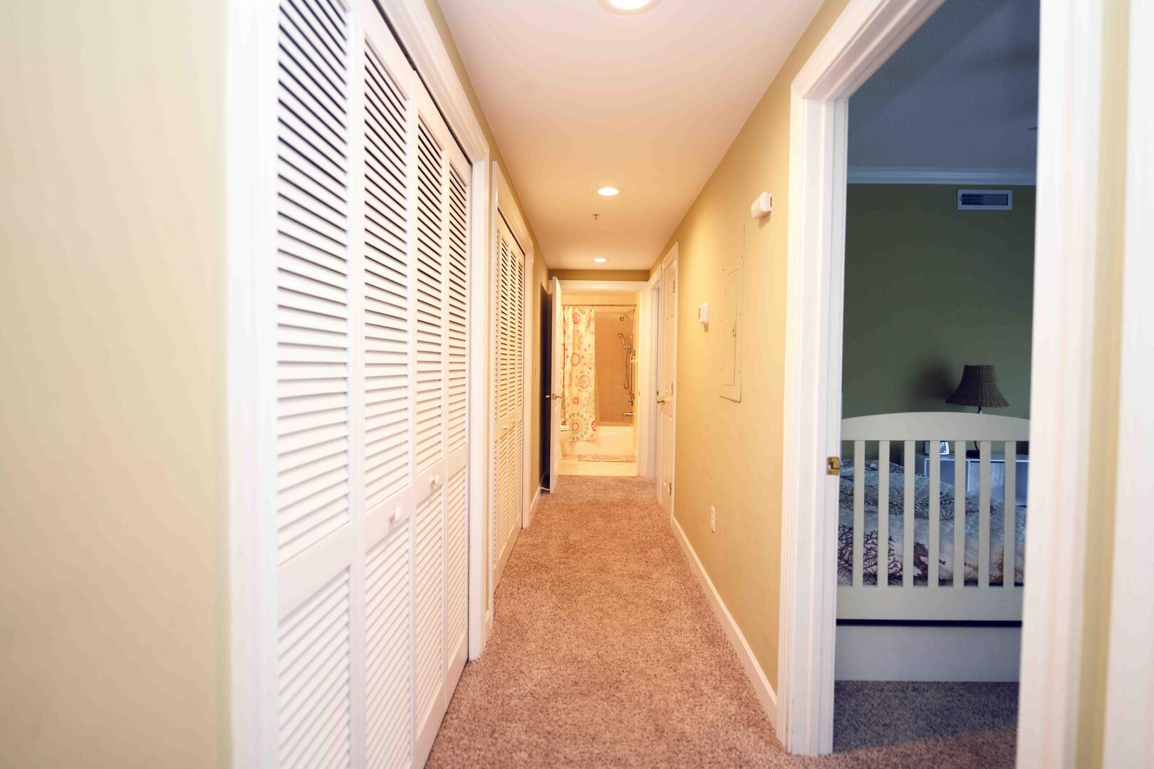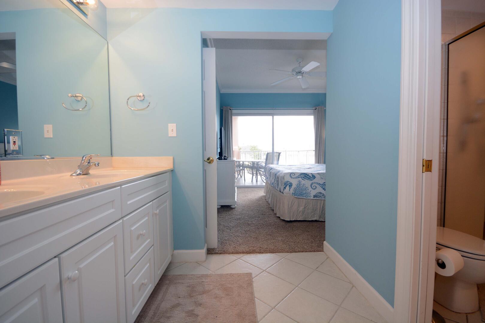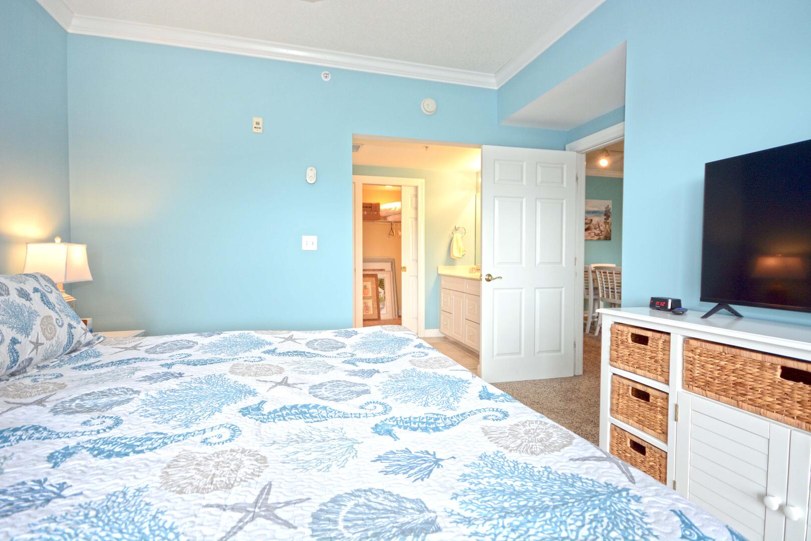 The living room is furnished with a comfortable couch, a section sofa with a queen sleep sofa and a flat screen television. The sliding balcony doors allow plenty of natural light to brighten the space. Right off the living room is a small dining area, perfect for meals with the family. Next to the dining area is the fully-stocked kitchen with a wide counter top, just right for grabbing a quick bite. The master bedroom has a king-size bed, a flat screen television, a private bathroom, and access to the balcony. The second bedroom has a queen-size bed, a flat-screen television, and balcony access. The third bedroom has a double size bed and twin, a television, and access to the hall bathroom. This property comfortably sleeps up to nine people, so bring the whole family!