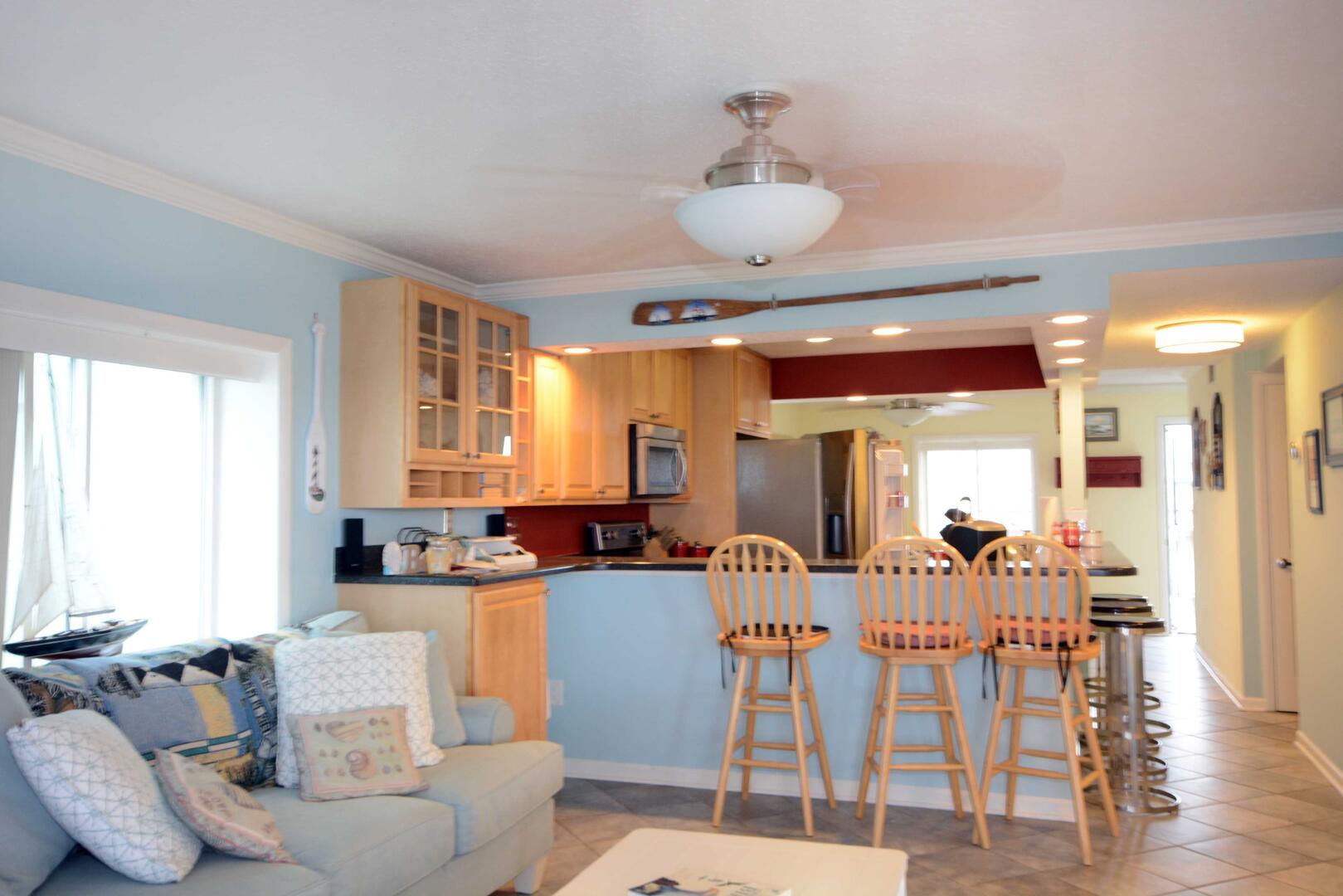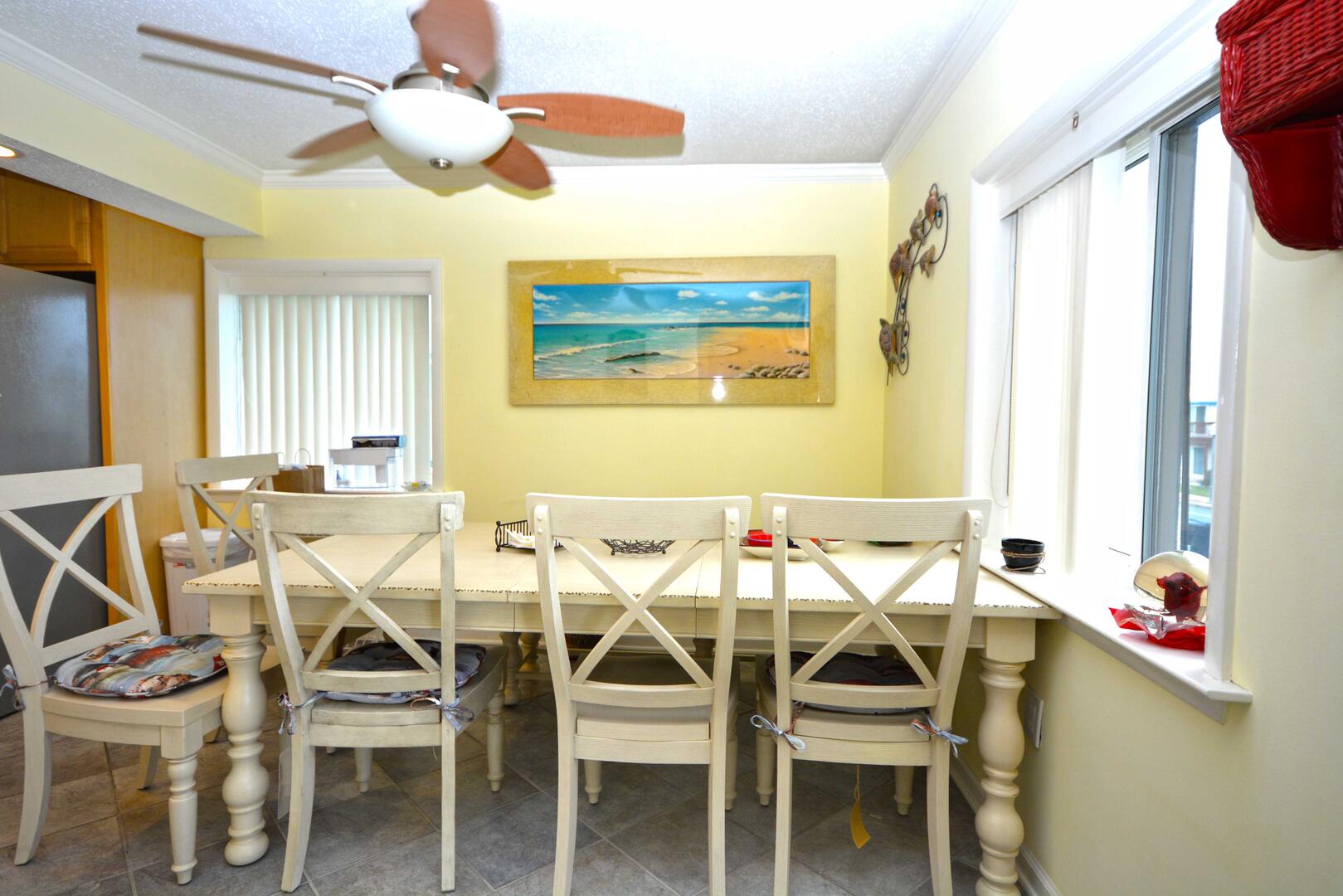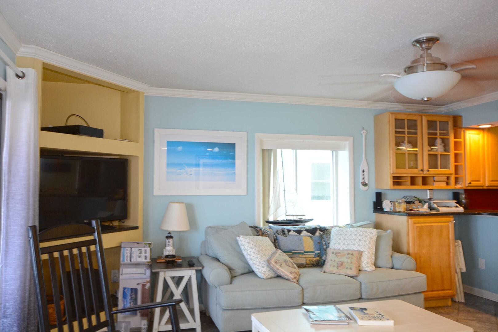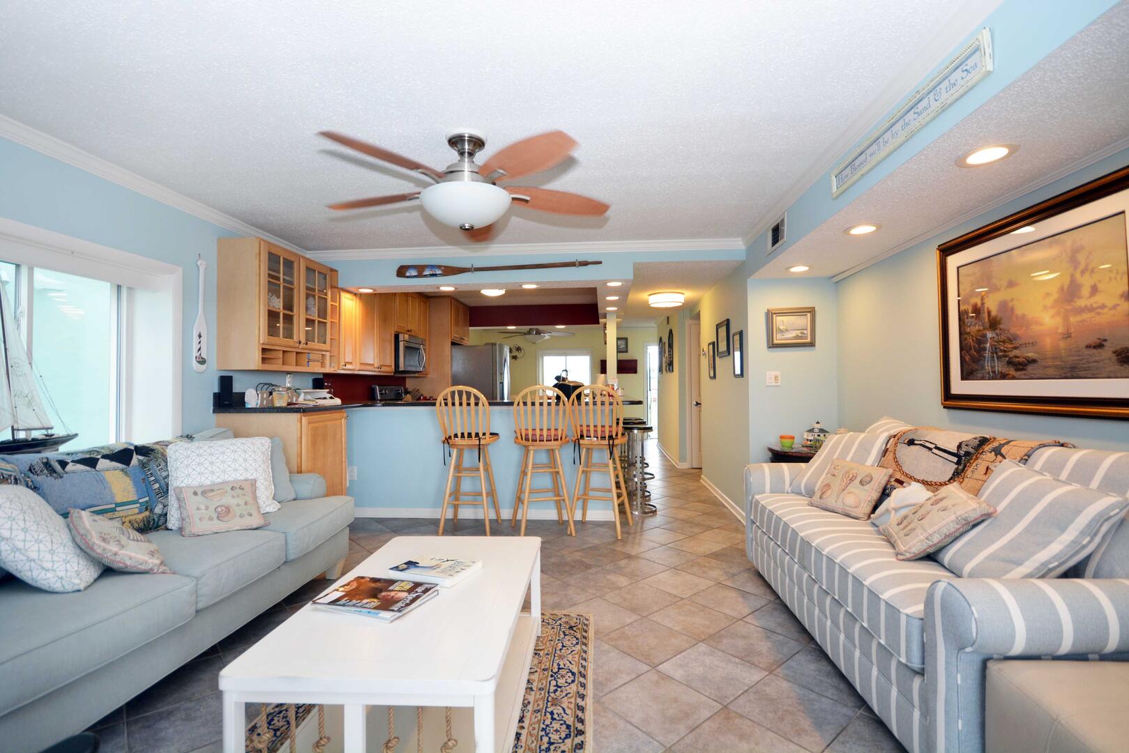 The blue hues in the light, airy living room with comfortable furnishings, plenty of seating to enjoy the beautiful open bay view. The sliding balcony doors allow plenty of natural light to brighten the space. Right off the living room is a dining area, perfect for meals with the family. The master bedroom has a king size bed, a private bathroom with access to the balcony. The second bedroom has a double bed and a set of bunk beds. The second bathroom is located in the hallway. This property comfortably sleeps up to six people, so bring the whole family!