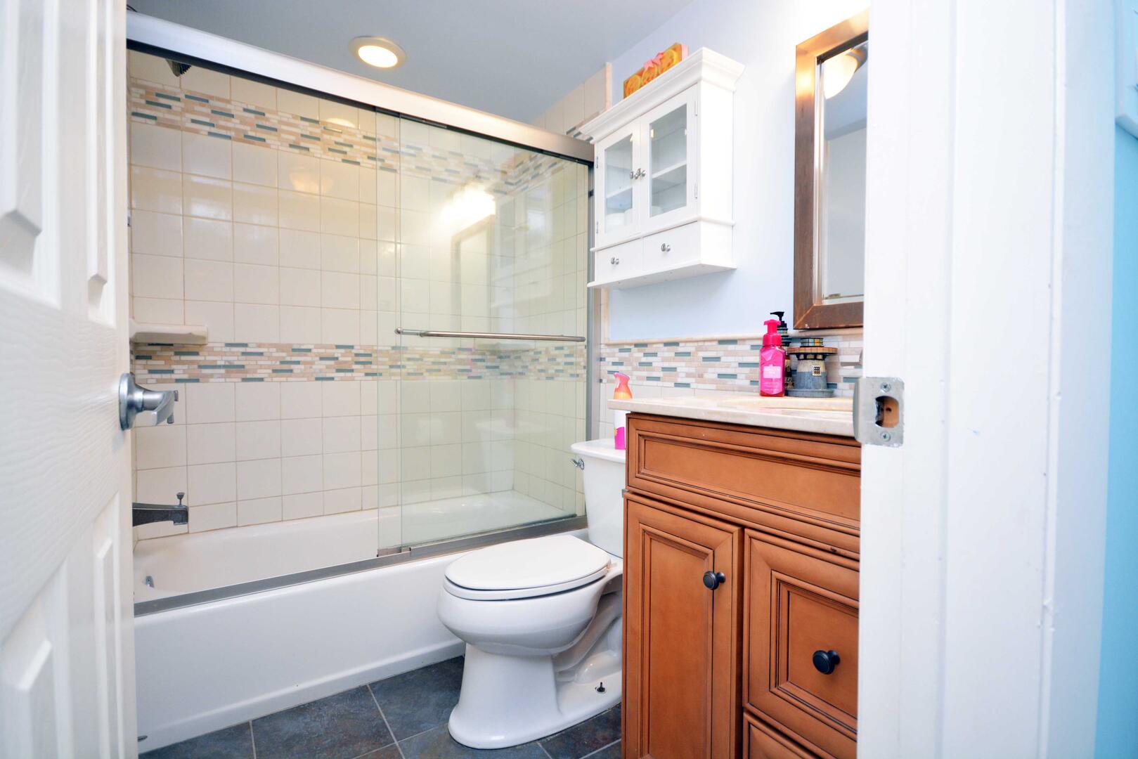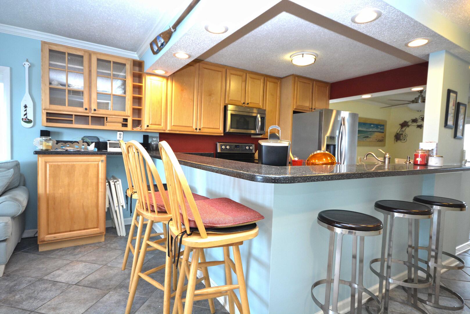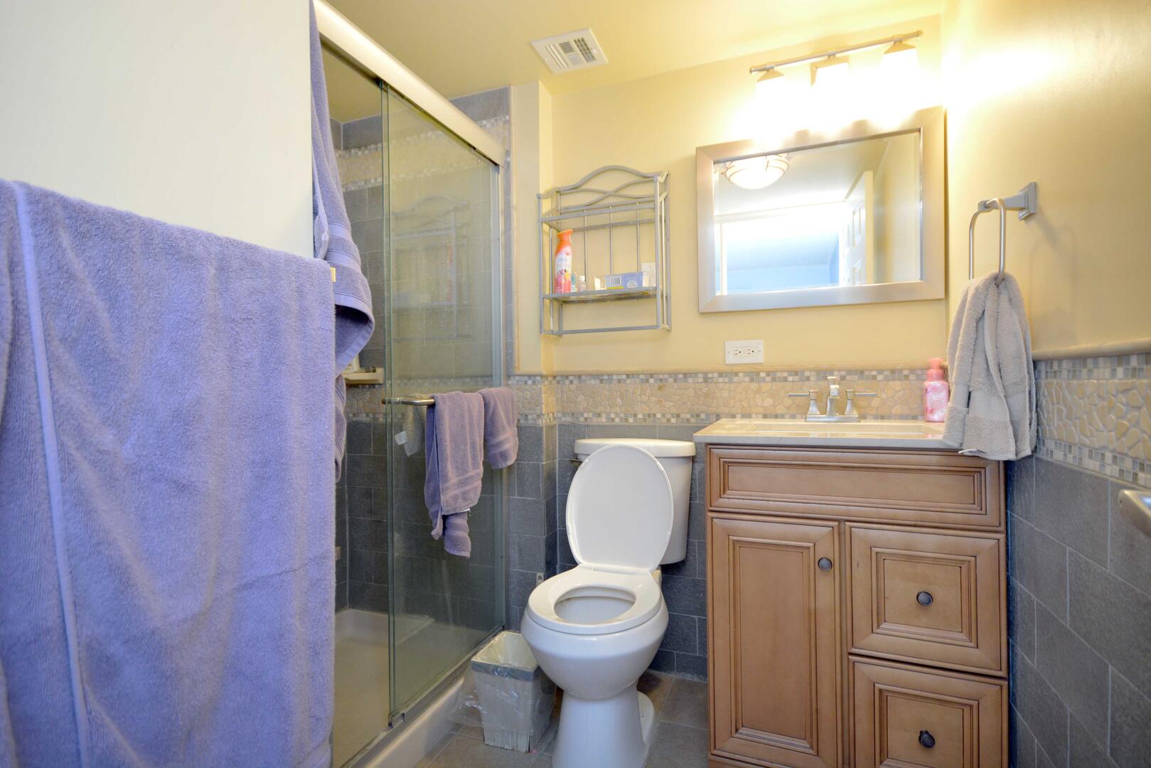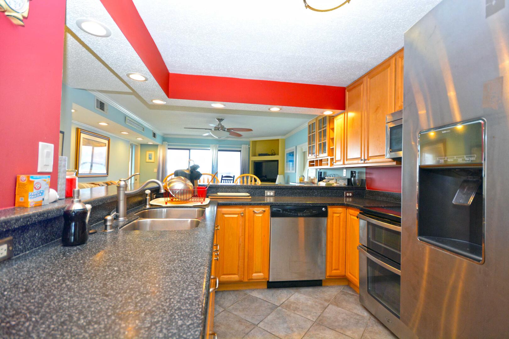 Unit 2D has the following amenities: central air conditioning, one parking space, two TVs, free WiFi, heat, stack washer and dryer, refrigerator, ice maker, microwave, coffee maker, toaster, stove, disposal, dishwasher, and an outdoor foot shower.