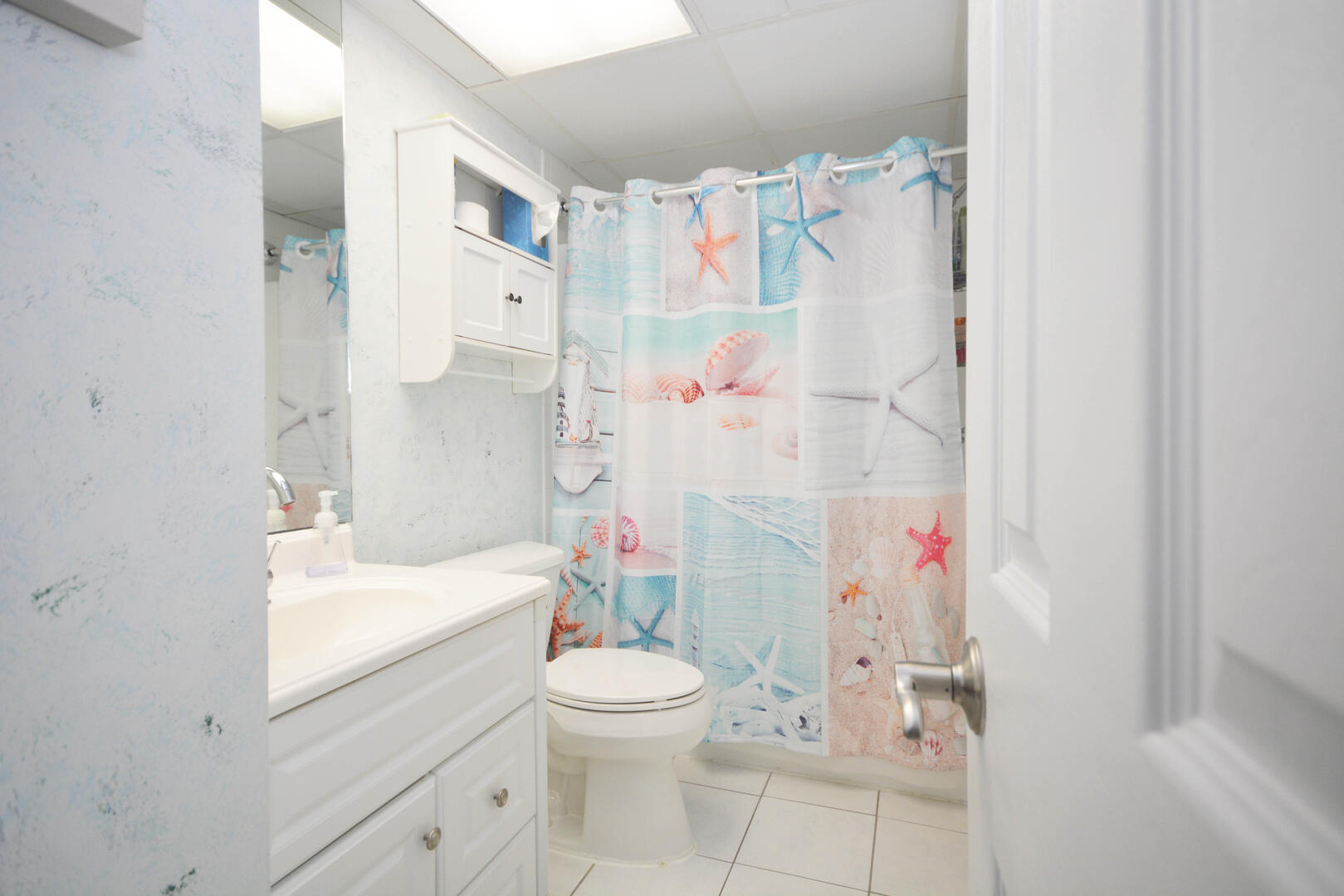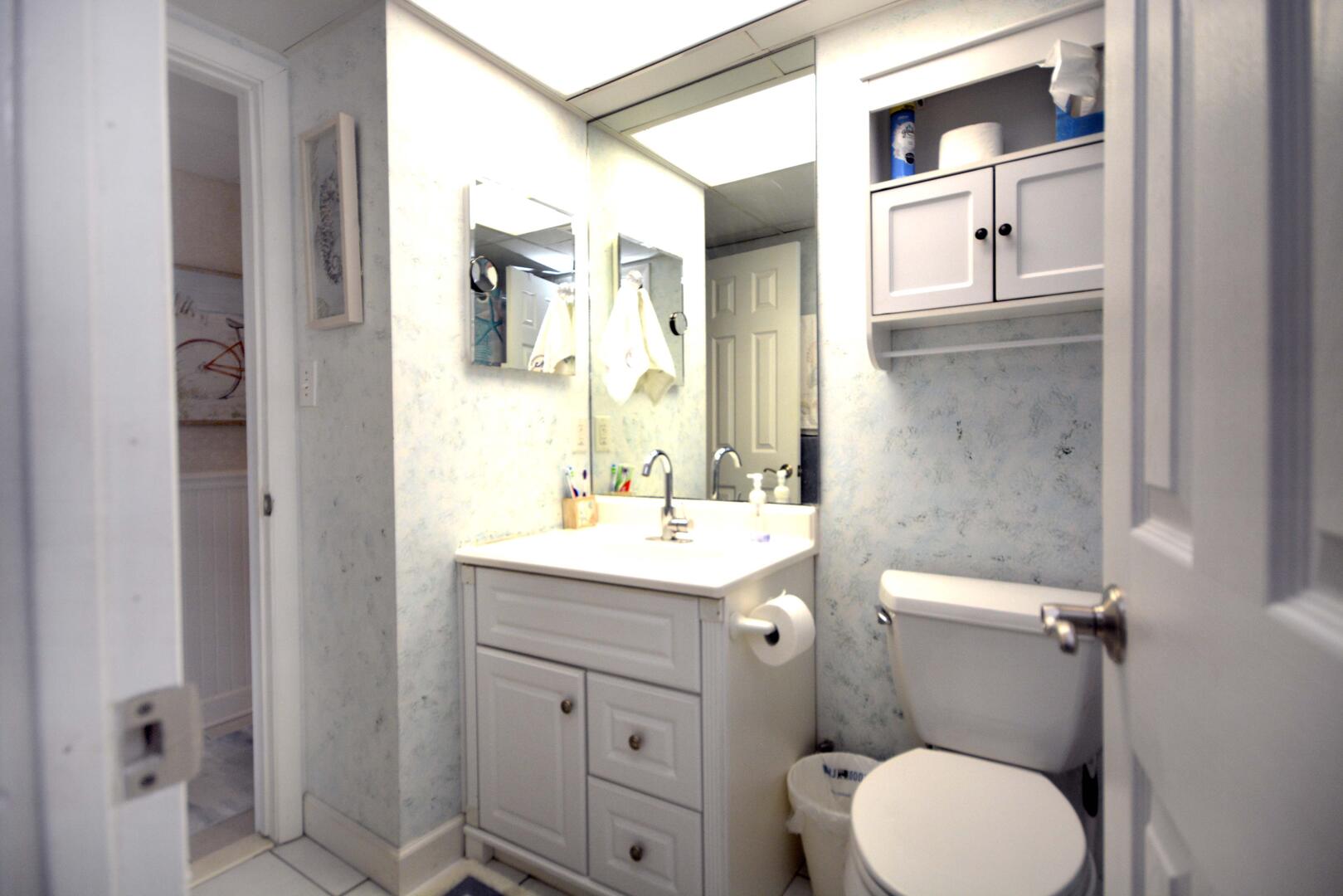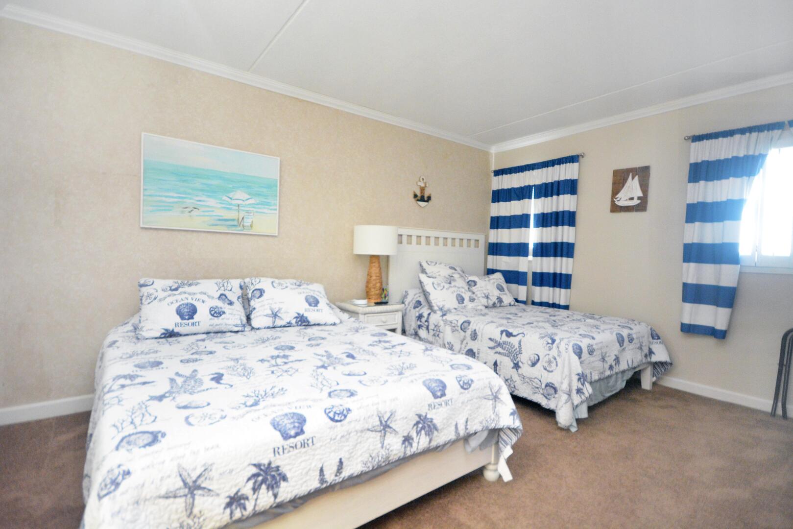 The spacious bedroom is furnished with a queen-size bed and a full-size bed, along with a nightstand, dresser, and coastal-themed decor. The full bathroom is bright and clean, featuring a shower/tub combo and updated fixtures.