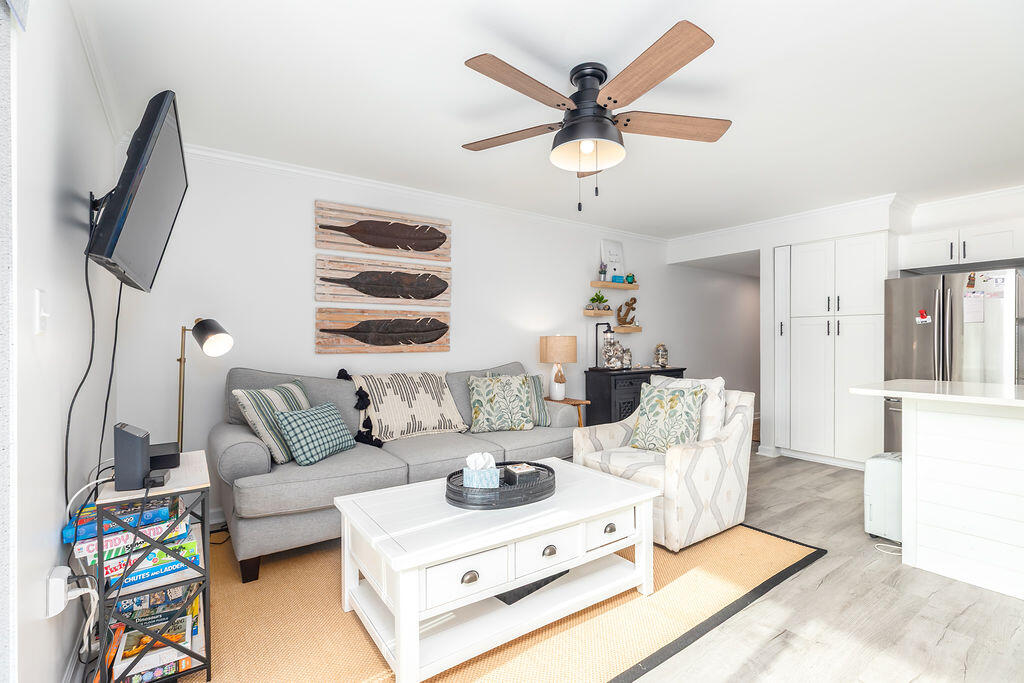 • Bright & Airy Living: Natural light floods the stylish living area, featuring a large LED HD TV and a cozy queen-size sleep sofa for extra guests.