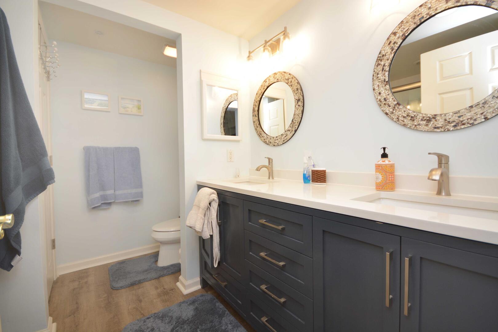 Surf Watch 101 is a modern three-bedroom, two-bathroom ocean block condo located in midtown Ocean City, MD. The living room has a sectional, that doubles as a queen sleep sofa, and two armchairs providing plenty of space for the whole family. There is a fully equipped kitchen with a breakfast bar and dining area for six. The master bedroom has a king size bed, television, and private bathroom. The second bedroom has a queen size bed while the third bedroom has a double bed. The second bathroom is in the hall. This property is only half a block from the beach and conveniently closely located to several restaurants including Seacrets. This property comfortably sleeps eight people.